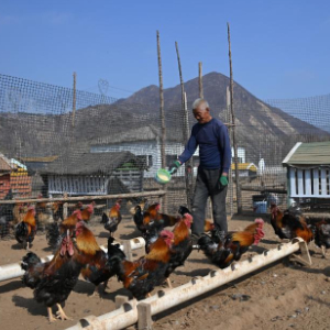 4月11日,农民在隆化县苔山镇三道营村一家“共享农场”喂鸡。
