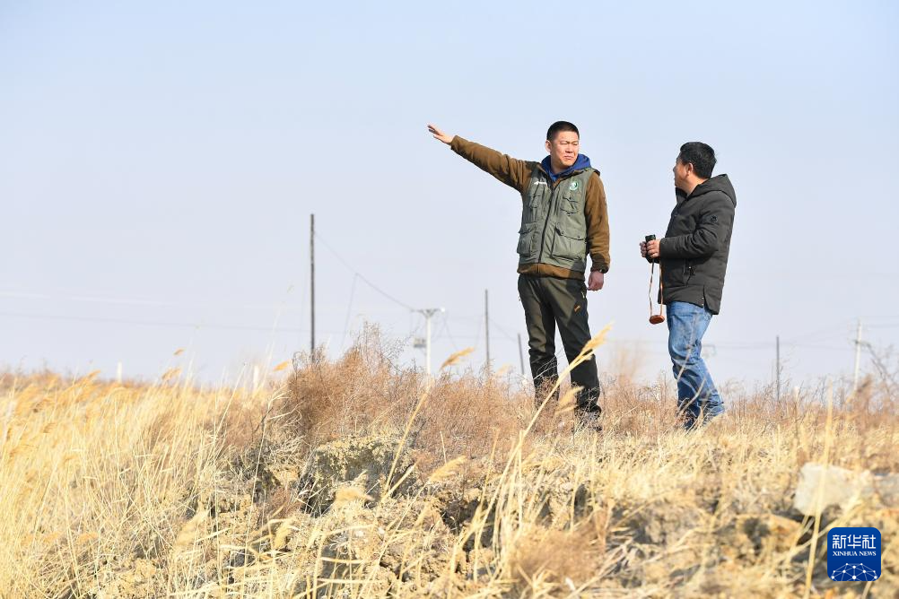4月10日,王凯与莫莫格国家级自然保护区管理局科研科科长王波(右)一起在保护区进行候鸟迁徙调查。