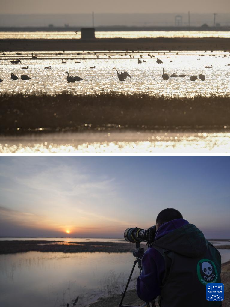 这是一张拼版照片。上图为:4月9日,候鸟在位于镇赉县的吉林莫莫格国家级自然保护区湿地内栖息(新华社发 王凯摄)。下图为:4月9日,王凯在保护区拍摄候鸟栖息情况(新华社记者 张楠 摄)。