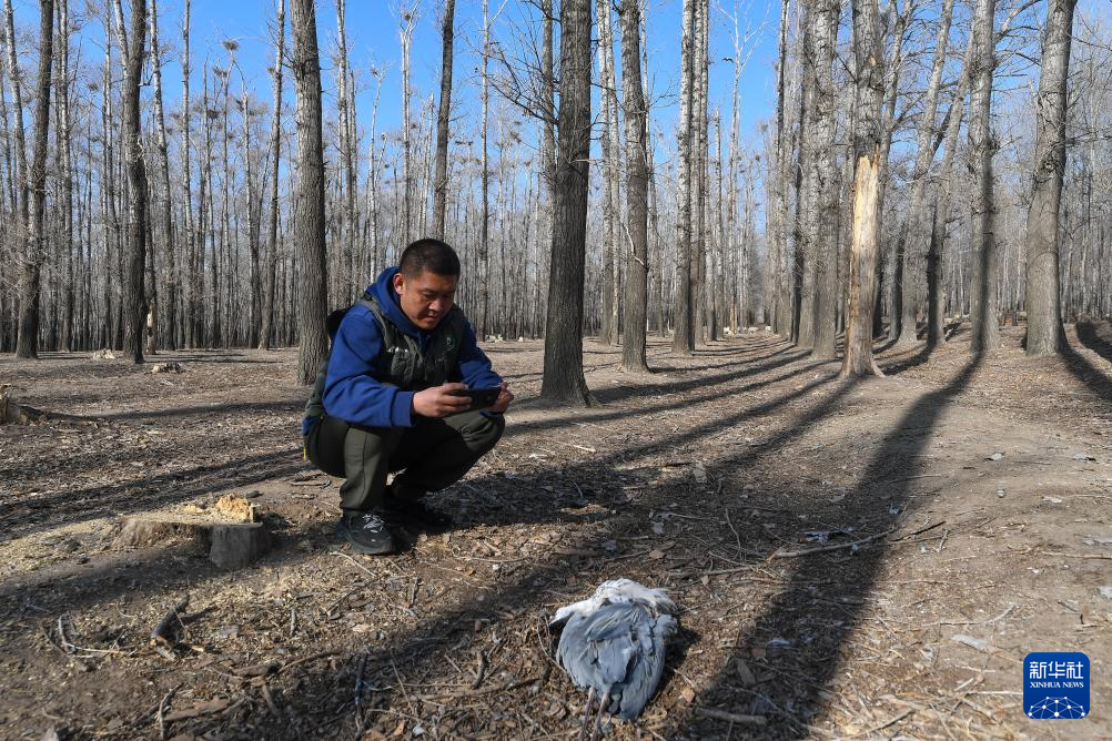 4月9日,在镇赉县莫莫格蒙古族乡卧卜村,王凯拍摄一只被野兽捕杀的苍鹭,将情况进行上报。