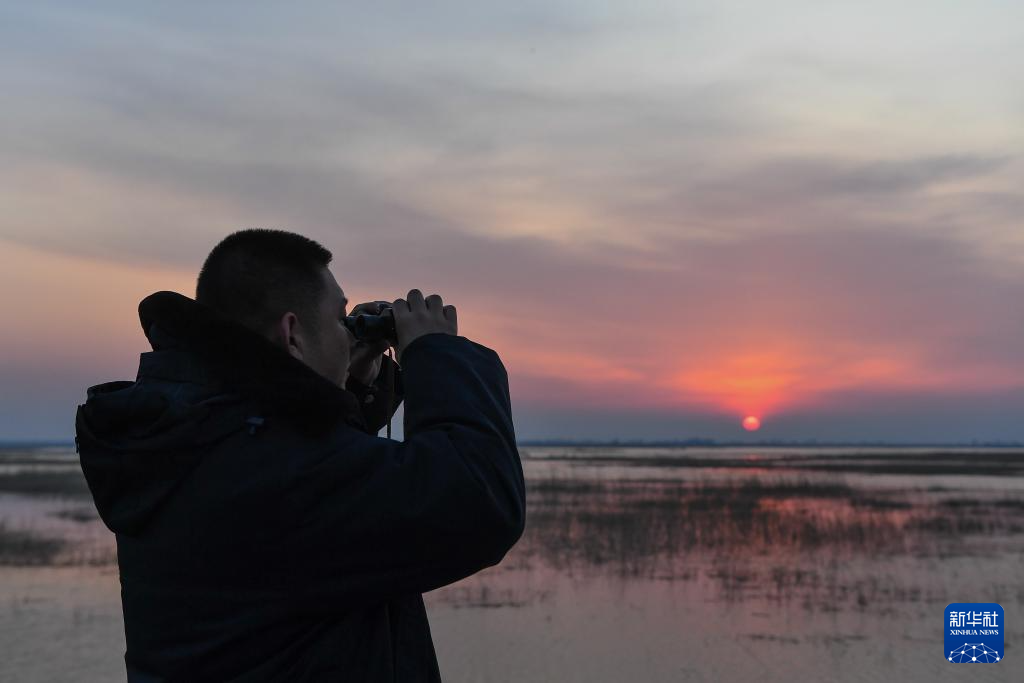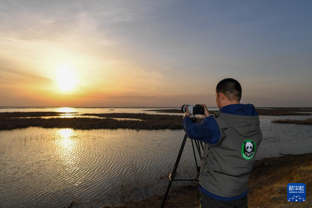 4月10日,在吉林莫莫格国家级自然保护区,王凯观察候鸟栖息情况。
