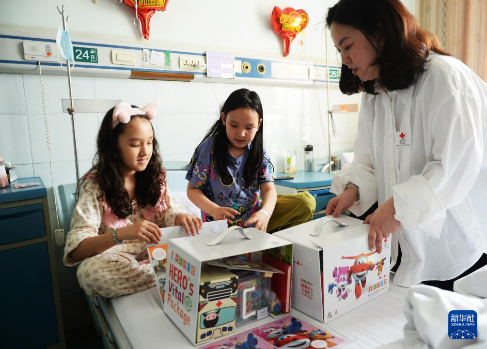 4月12日,在山东第一医科大学附属中心医院,中国红十字基金会工作人员为两名成功进行完手术的孩子送上礼物。