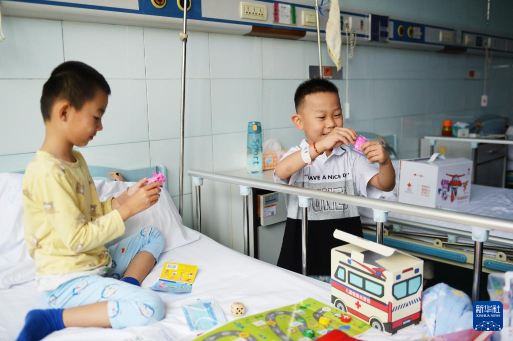 4月12日,在山东第一医科大学附属中心医院,两名来自新疆的先心病患儿在病房查看他们收到的礼物。