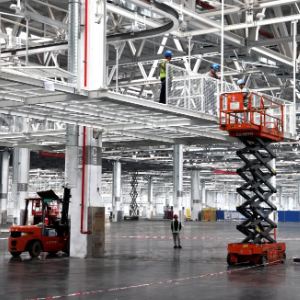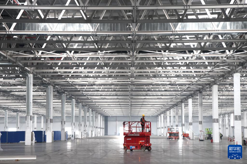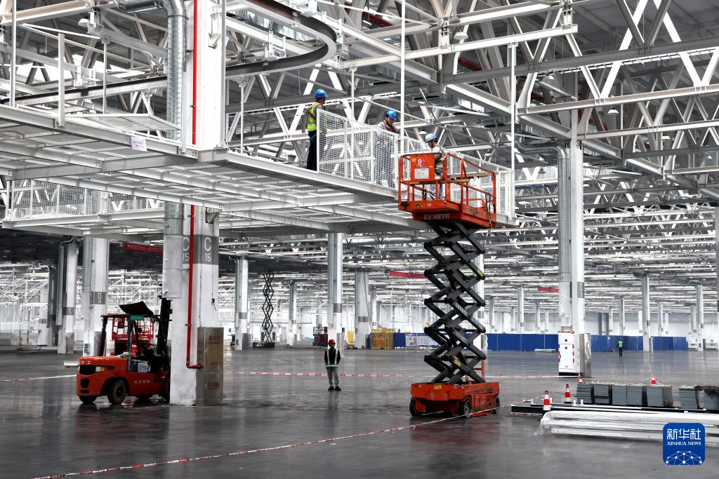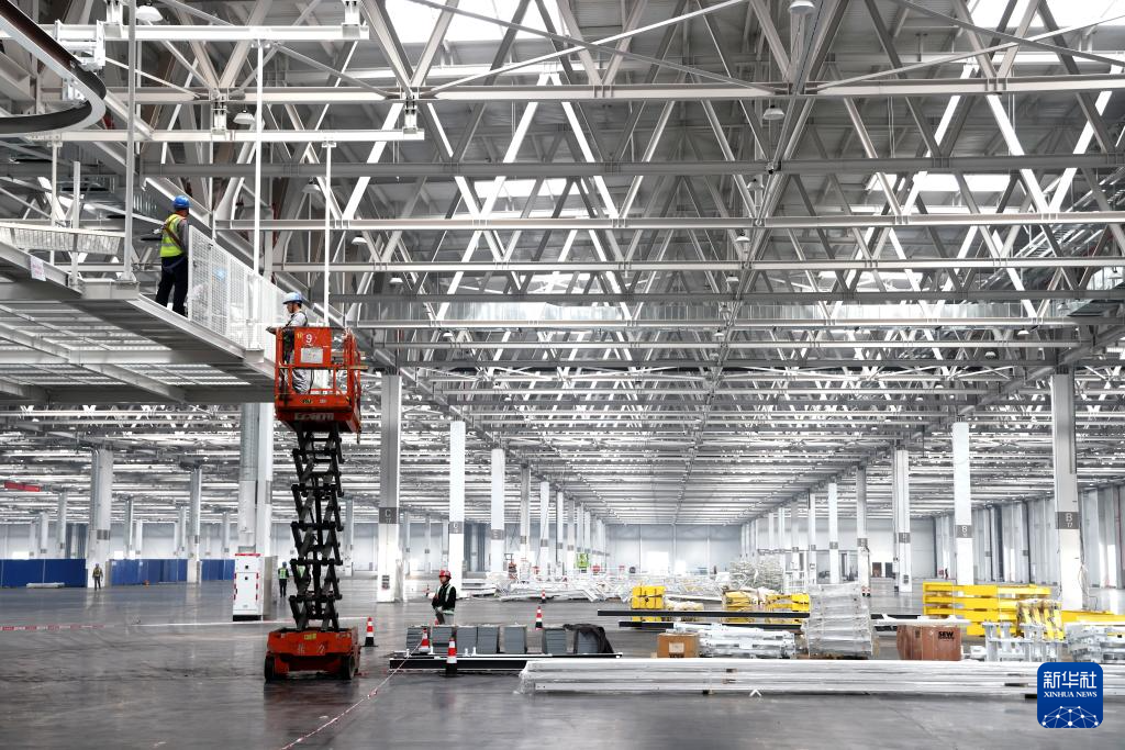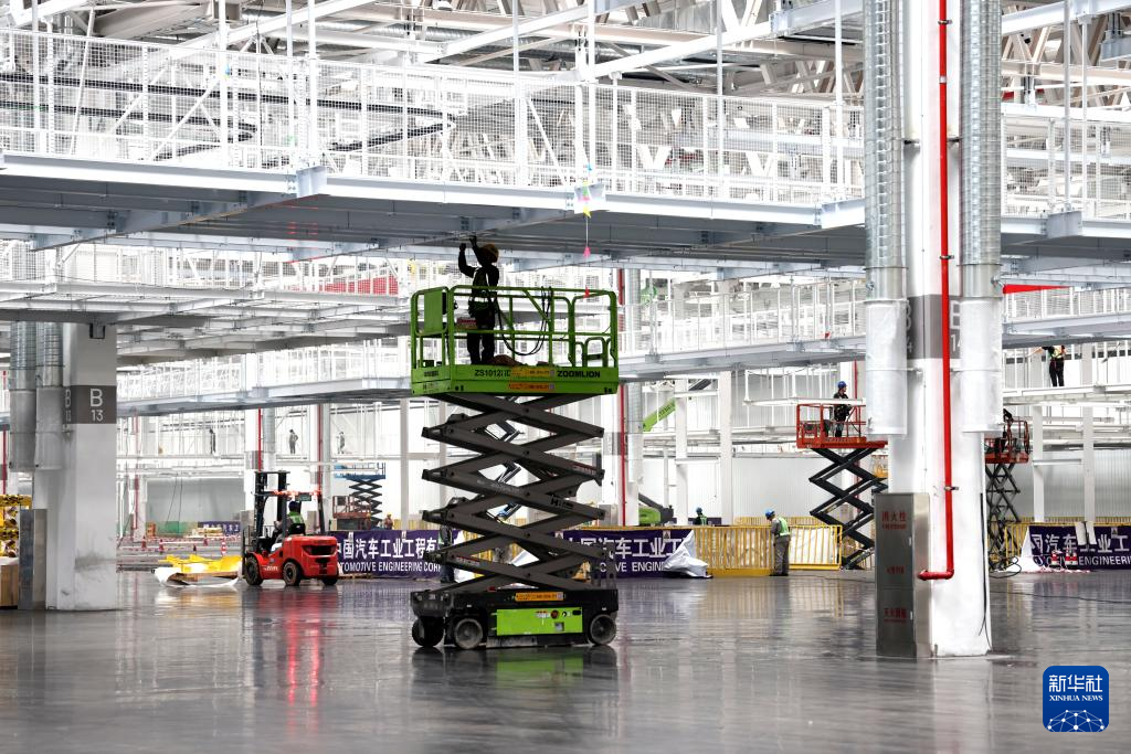 4月12日,在肥西县在建的新能源汽车产业园,工人在智能新能源乘用车项目总装车间施工。