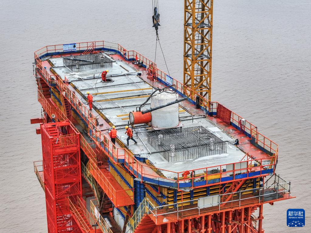 4月12日拍摄的甬舟铁路西堠门公铁两用大桥6号墩建设现场(无人机照片)。