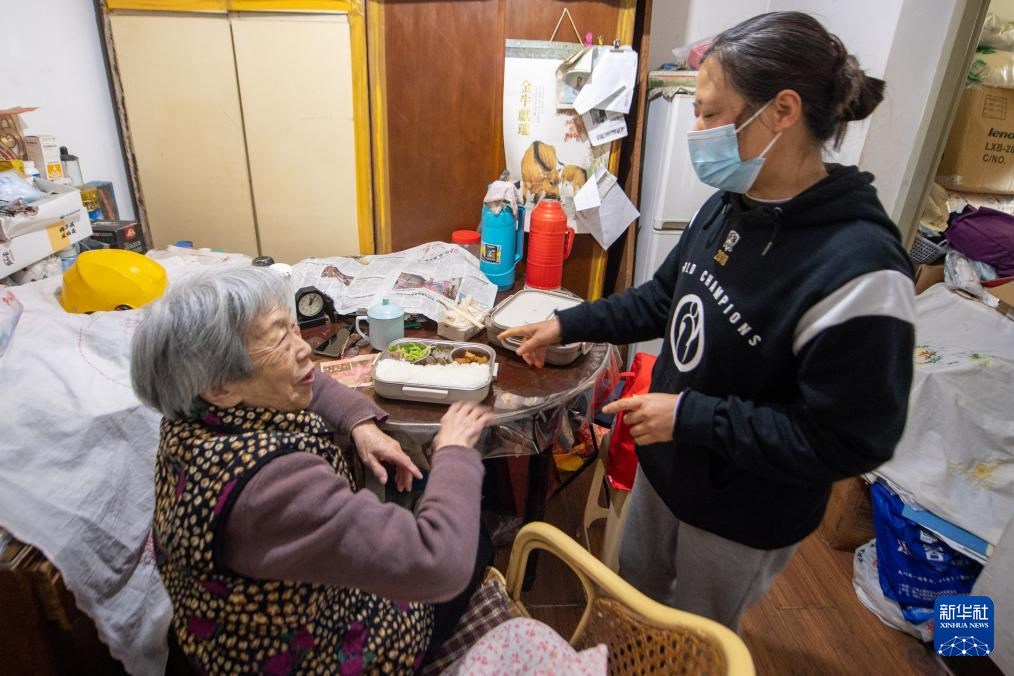 4月12日,宁波市江北区大闸社区社工为社区内独居老人送餐。