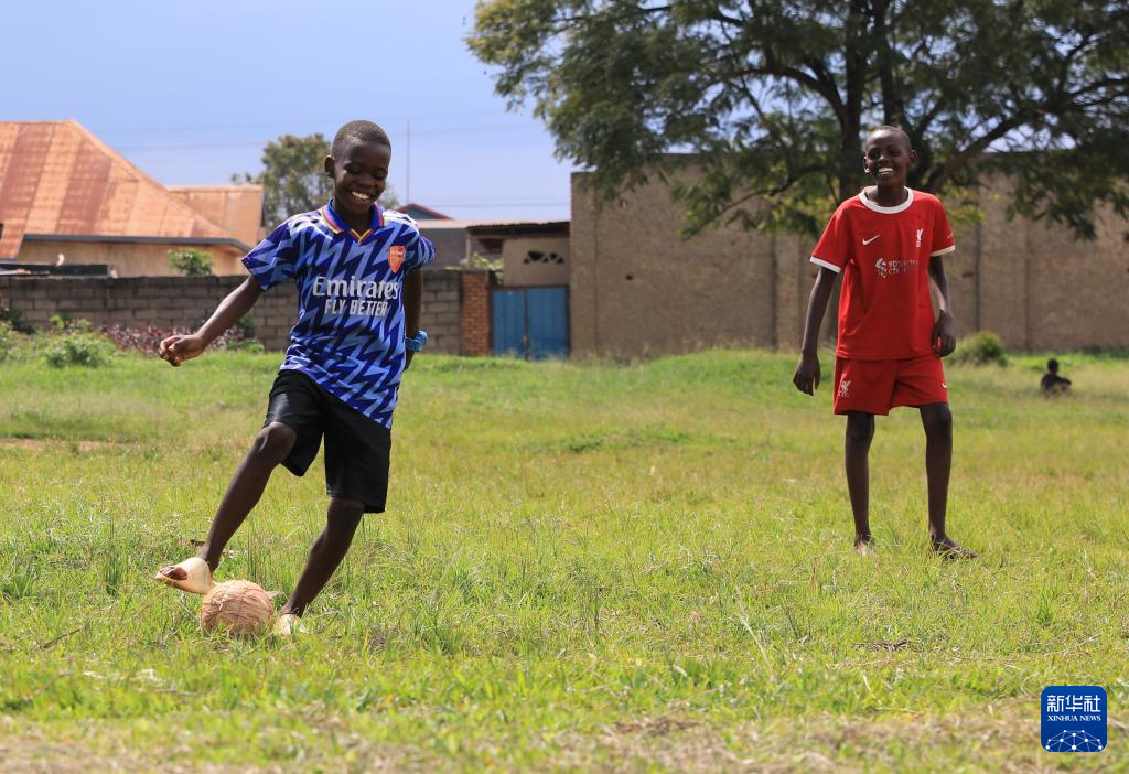 4月9日,在卢旺达基加利,两名男孩在布盖塞拉国际机场路升级改造路段旁踢足球。