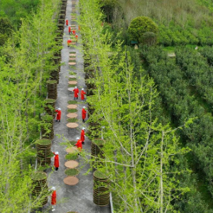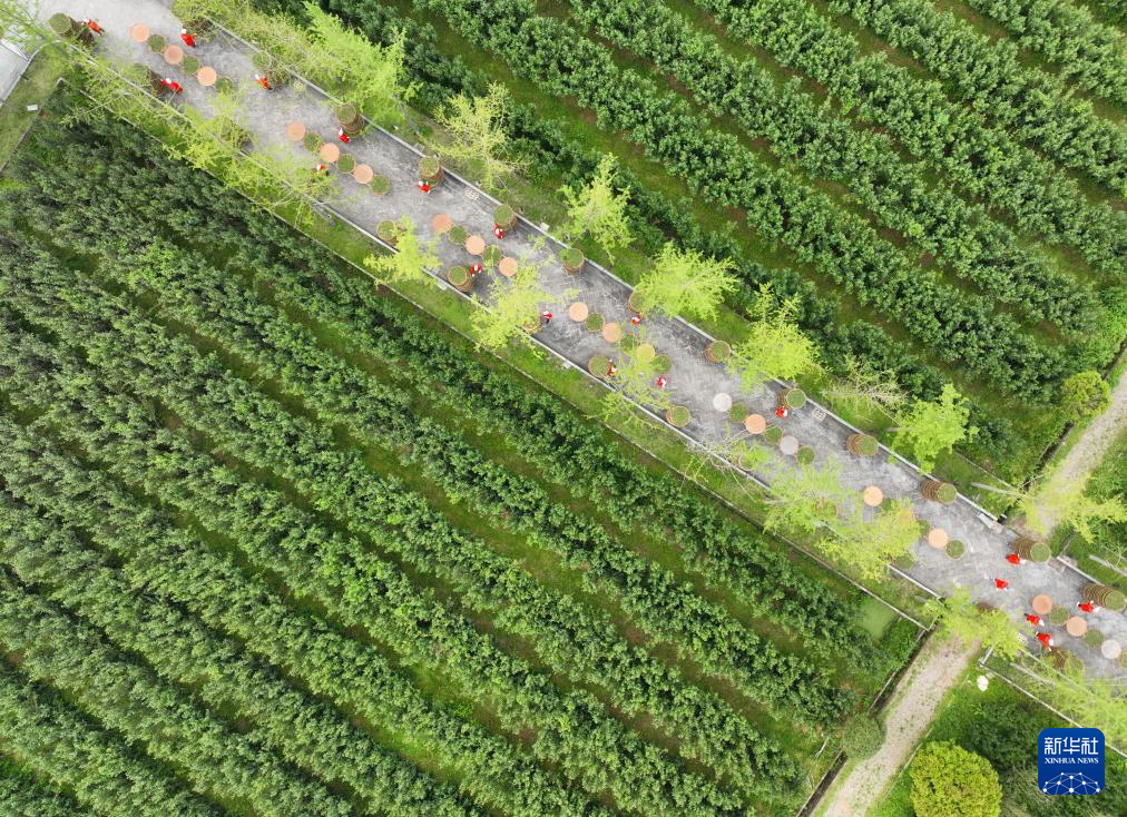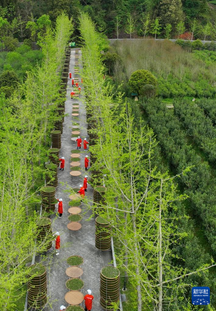 4月10日,工人在位于福鼎市点头镇大坪村的六妙白茶庄园晾晒茶青(无人机照片)。