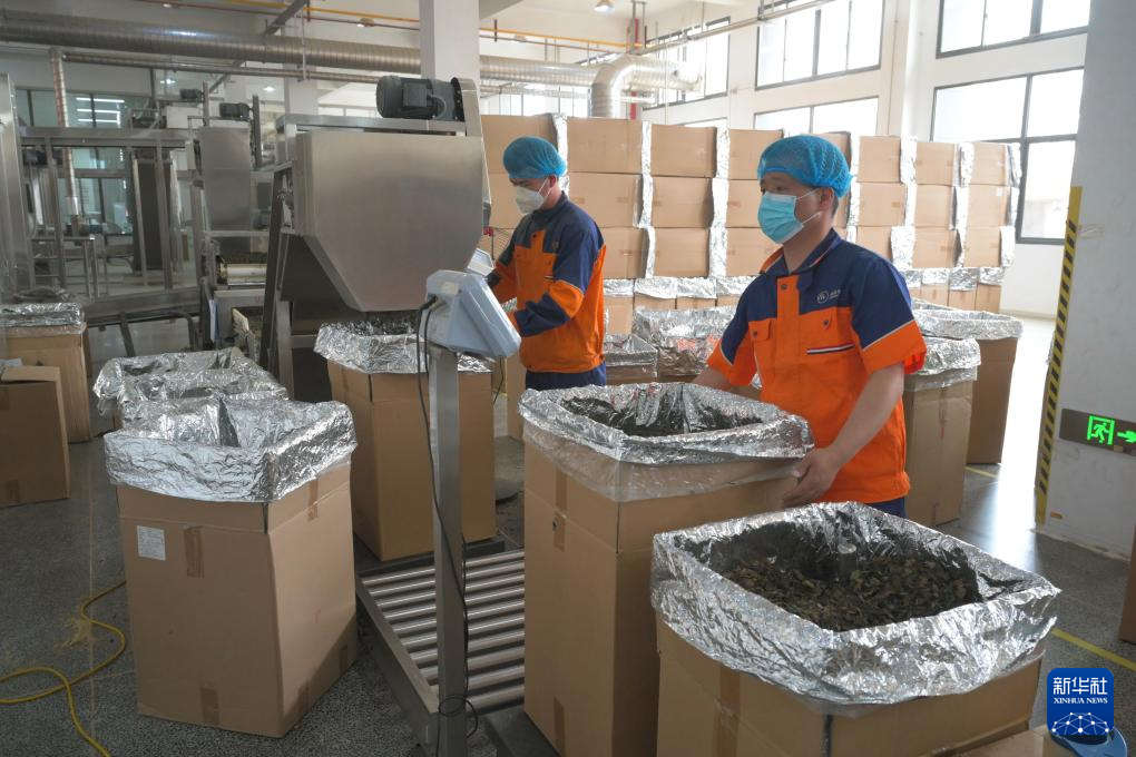 4月10日,福建品品香茶业有限公司工人在生产车间包装白茶半成品。