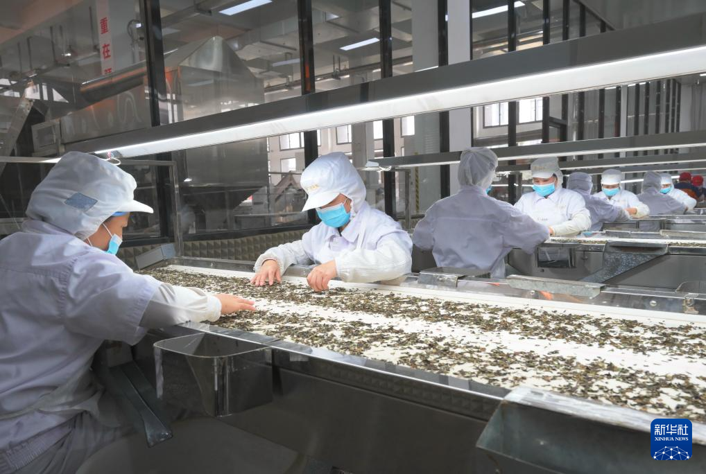 4月10日,福建品品香茶业有限公司工人在生产车间流水线上挑拣茶叶。