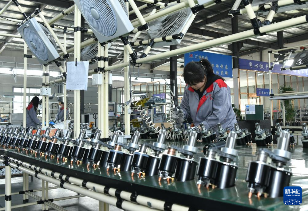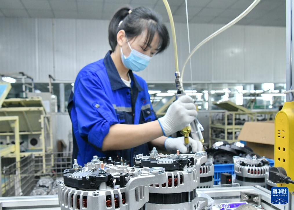 4月11日,河北省河间市一家再制造企业的工人在汽车零部件生产线上工作。