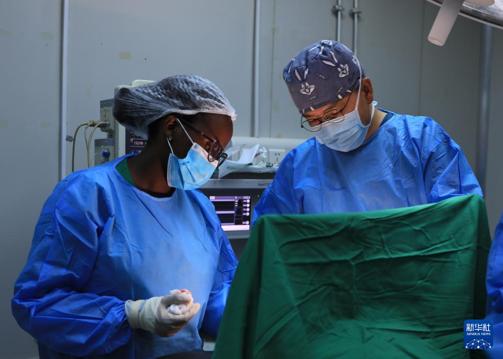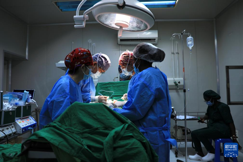 4月9日,在距卢旺达首都基加利约20公里的马萨卡医院,中国医疗队队长、普外科医生张和平(左二)在做手术。