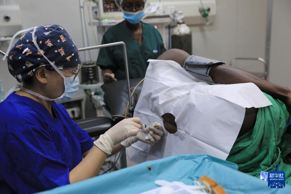 4月9日,在距卢旺达首都基加利约20公里的马萨卡医院,中国医疗队麻醉科医生陶慧进行术前麻醉。