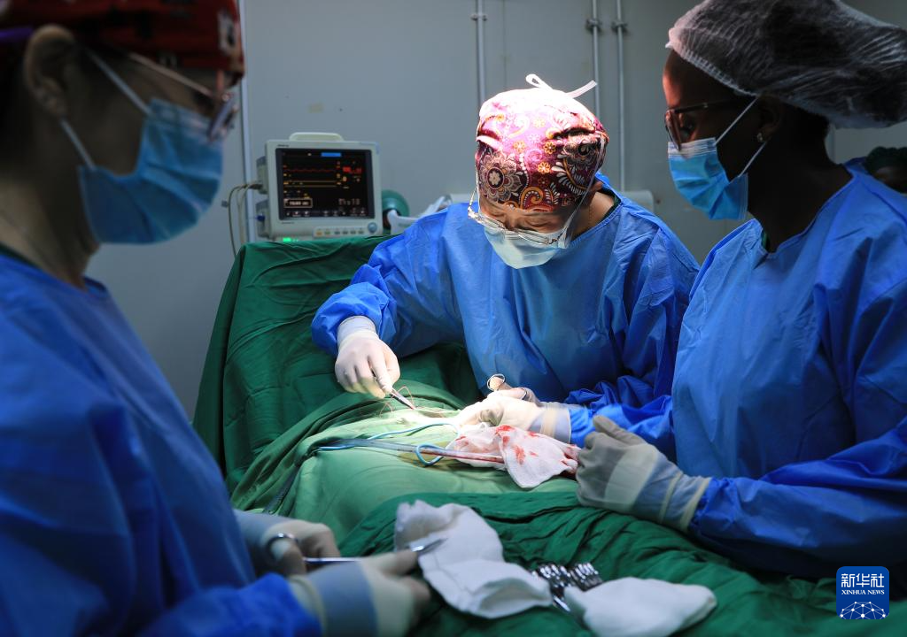 4月9日,在距卢旺达首都基加利约20公里的马萨卡医院,中国医疗队妇产科医生孙红梅(中)做术后缝合。