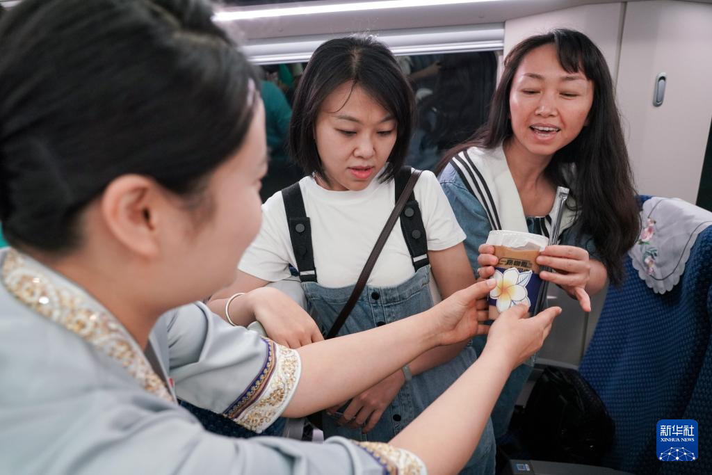 4月13日,工作人员在中国西双版纳至老挝琅勃拉邦首发列车上邀请旅客品尝由中老两国咖啡豆拼制而成的咖啡。