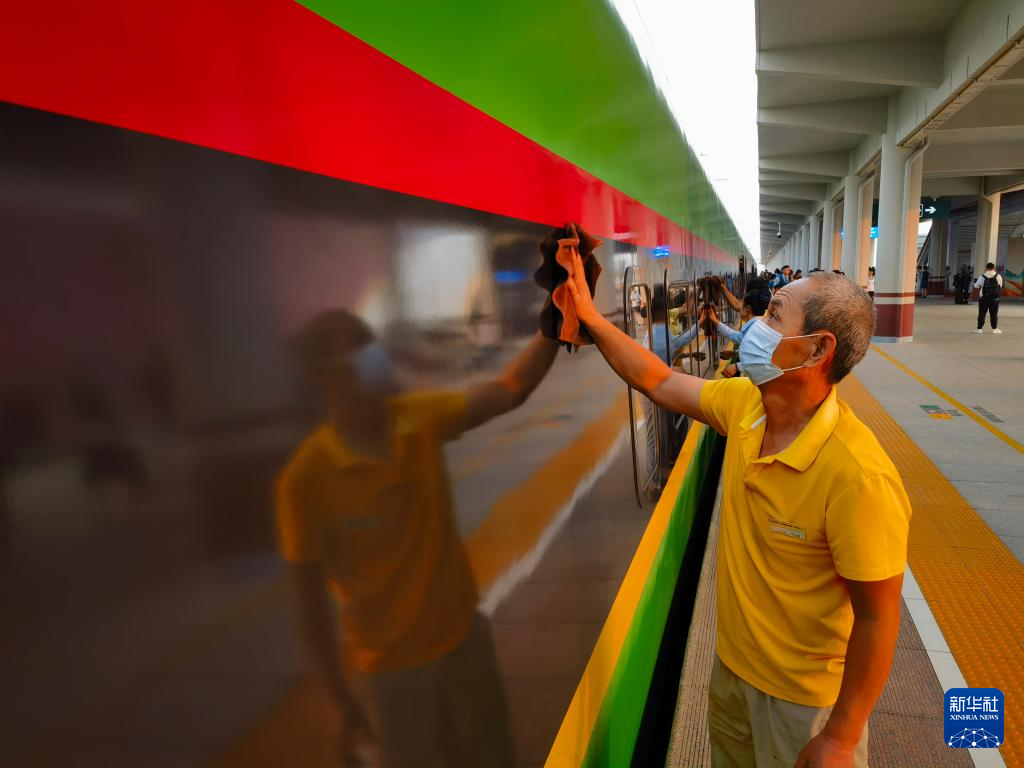 4月13日,在西双版纳站,工作人员擦拭即将出站的中国西双版纳至老挝琅勃拉邦首发列车。