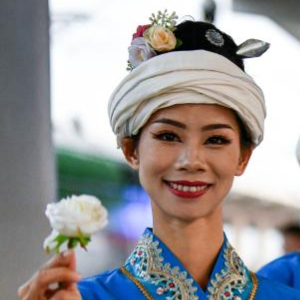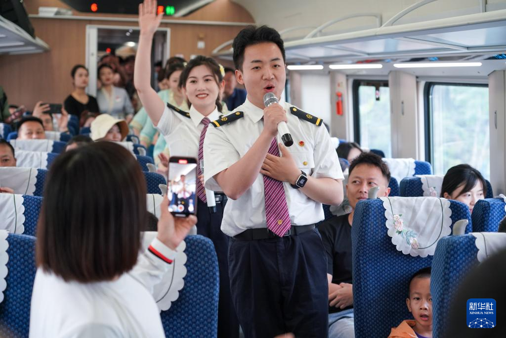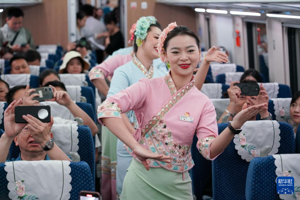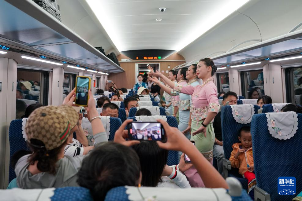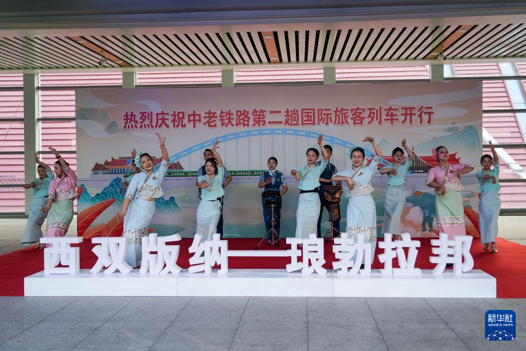 4月13日,工作人员在中国西双版纳至老挝琅勃拉邦首发列车上表演。