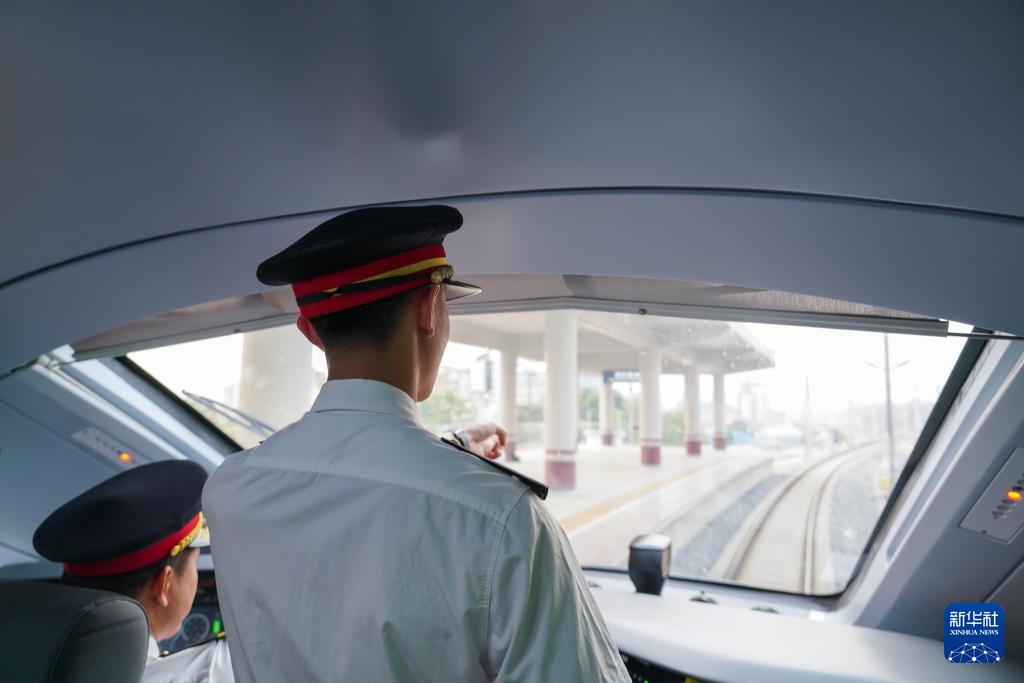 4月13日,中国西双版纳至老挝琅勃拉邦首发列车车组成员在驾驶室内准备发车。