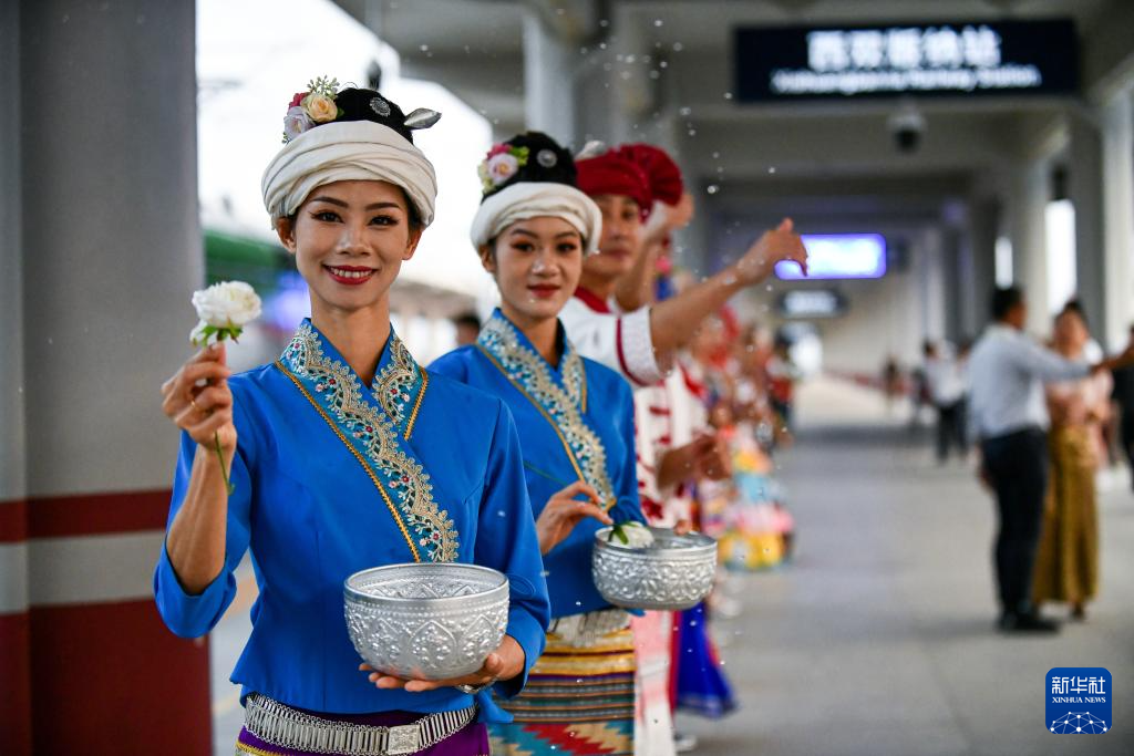 4月13日,在西双版纳站,工作人员欢迎乘坐中国西双版纳至老挝琅勃拉邦首发列车的旅客。