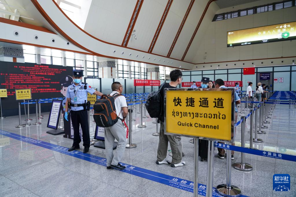 4月13日,旅客在磨憨铁路口岸排队办理出境手续。