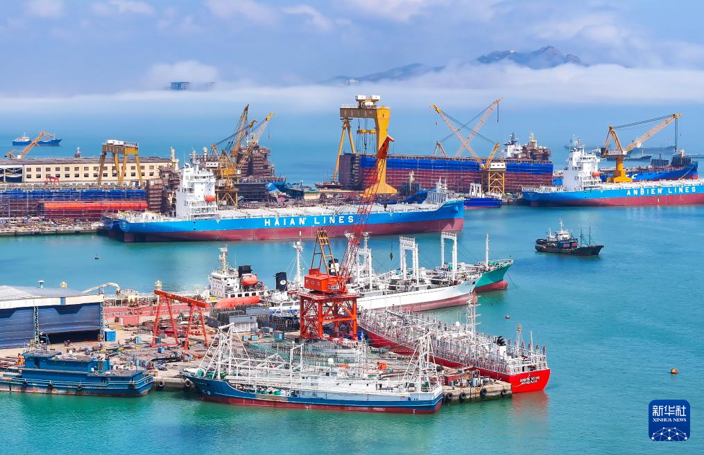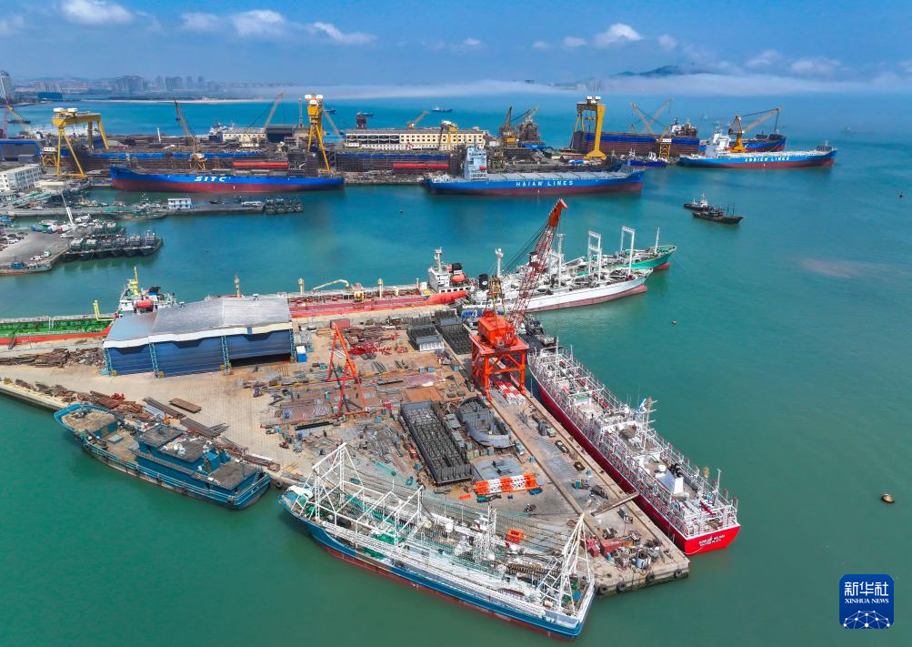 最近,在山东省荣成市石岛管理区修造船产业基地,工人们抓紧维修、建造各类大型船舶,基地内呈现—派繁忙、有序的生产景象。