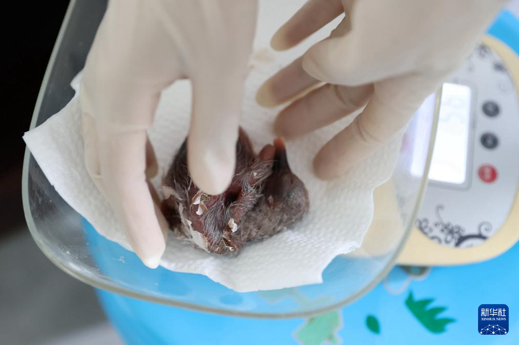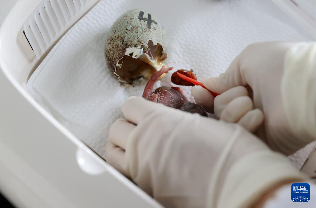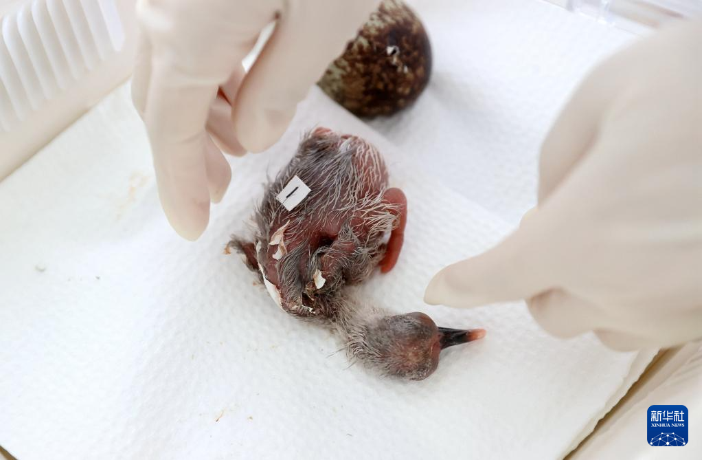 4月13日,在浙江省湖州市德清县下渚湖朱鹮繁育研究基地,工作人员检查刚出壳的朱鹮幼鸟。