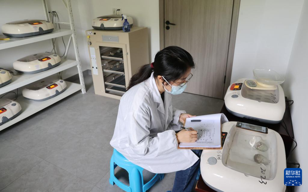 4月13日,在浙江省湖州市德清县下渚湖朱鹮繁育研究基地,工作人员检查朱鹮孵化情况。