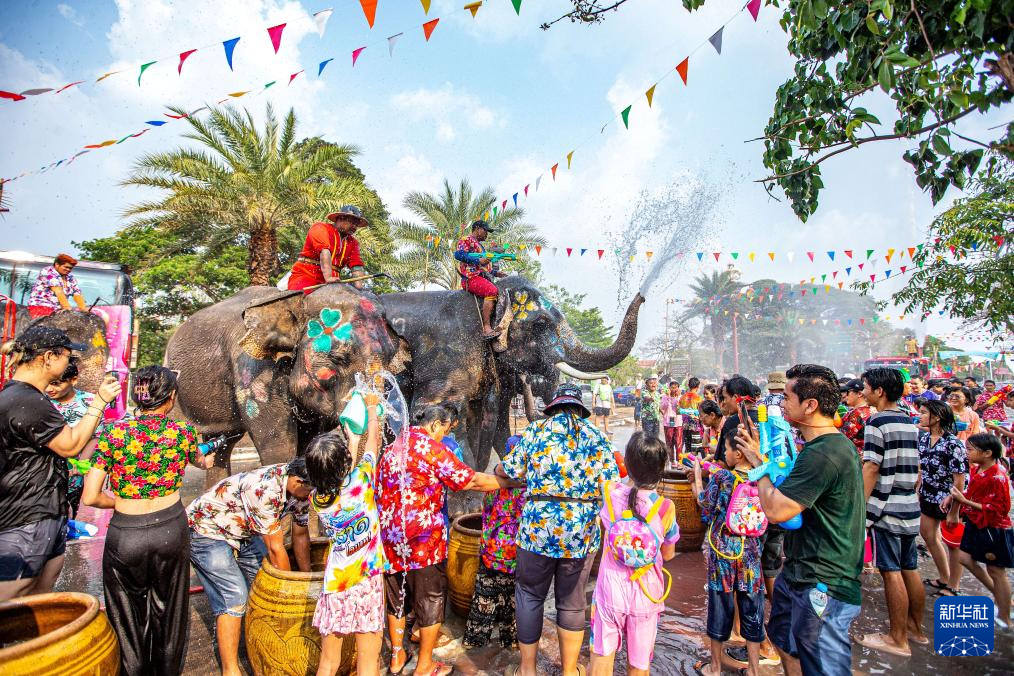 4月13日,在泰国大城府,人们与大象泼水庆祝宋干节。