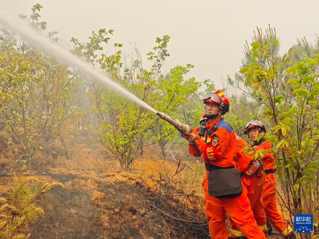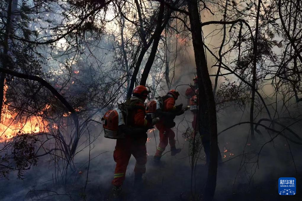 4月14日,消防救援人员在云南晋宁森林火灾现场扑救。