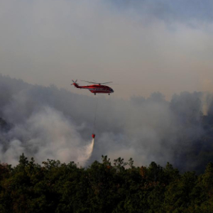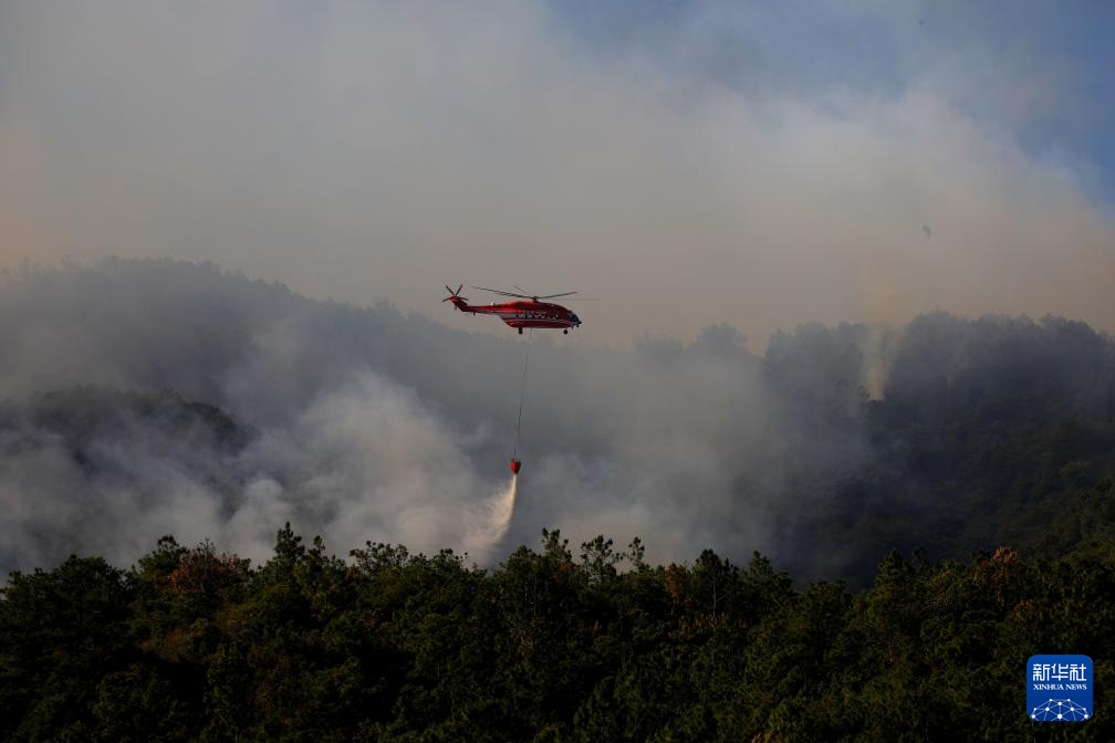 4月14日,直升机在云南晋宁森林火灾现场进行灭火作业。