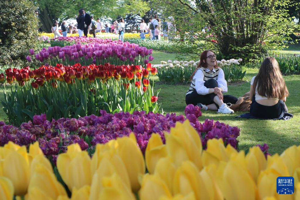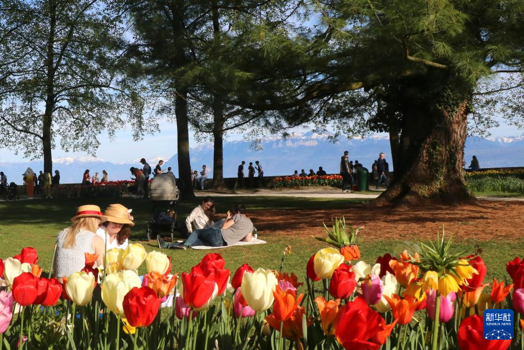4月13日,在瑞士莫尔日,人们在盛开的郁金香旁休闲。