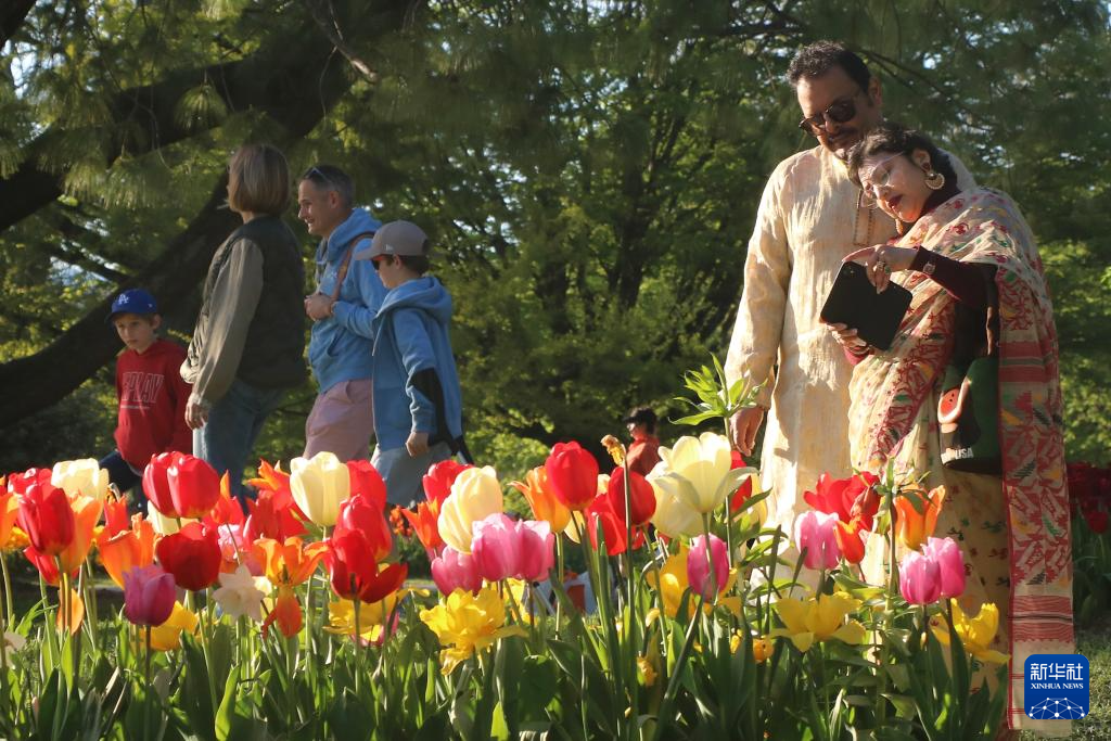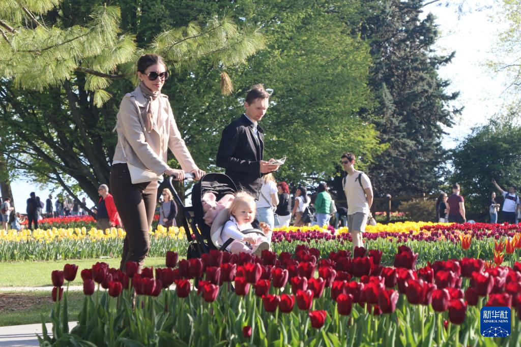 4月13日,在瑞士莫尔日,人们观赏盛开的郁金香。