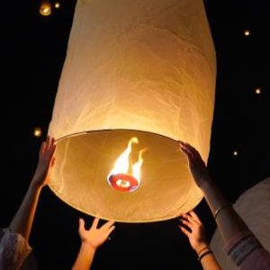 4月13日晚,在云南省西双版纳傣族自治州景洪市,人们在澜沧江边放飞孔明灯,庆祝泼水节。