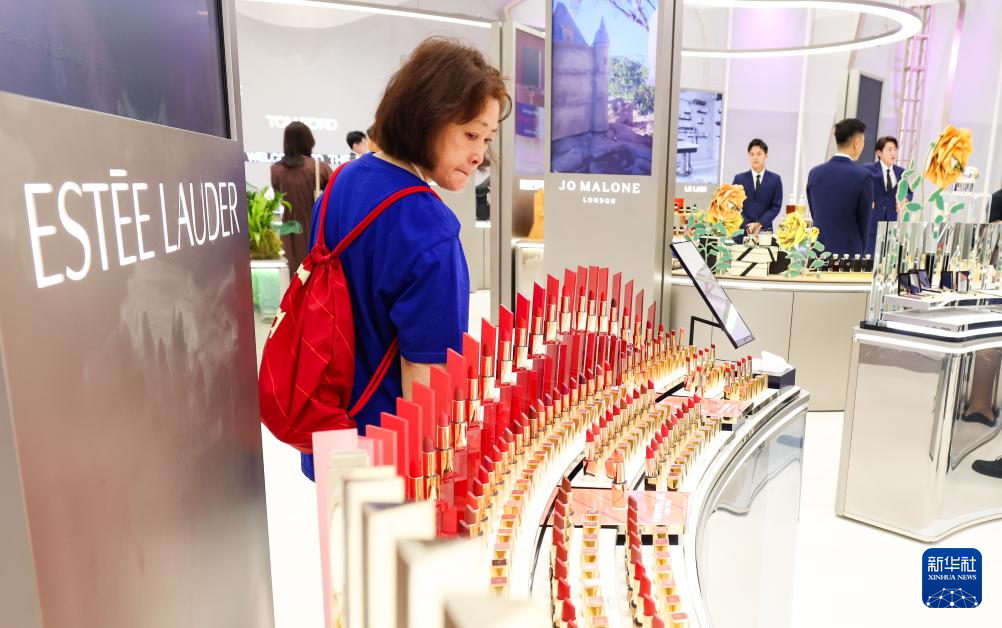 4月15日,观众在第四届消博会上的雅诗兰黛集团展台了解产品。