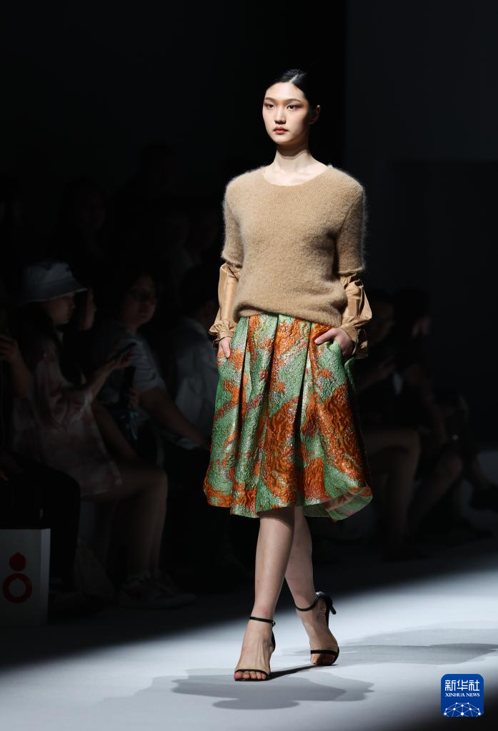4月15日,在海口国际免税城消博会时装周主秀场,模特在展示时装作品。