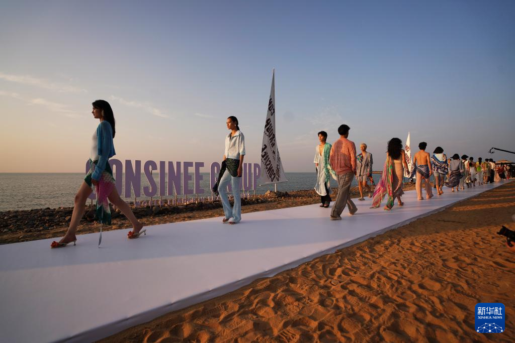 4月15日,在位于海口的消博会海边秀场,模特在展示时装作品。