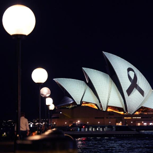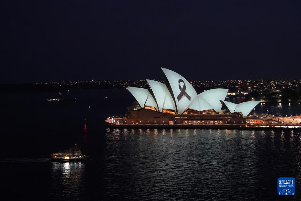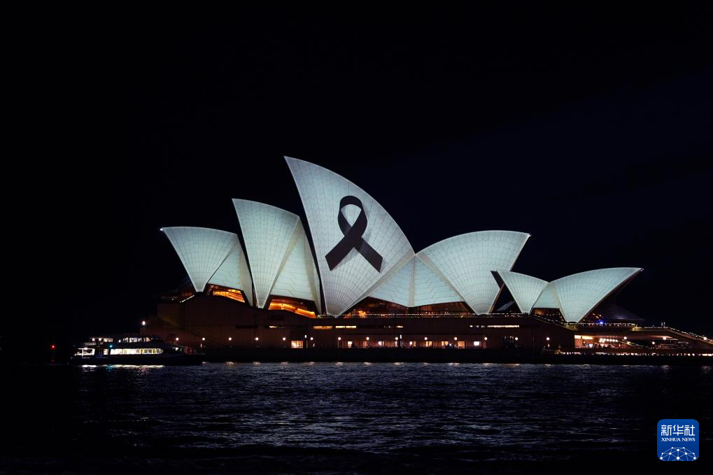 4月15日,悉尼歌剧院点亮“黑丝带”,悼念13日悉尼商场持刀袭击事件中的遇难者。