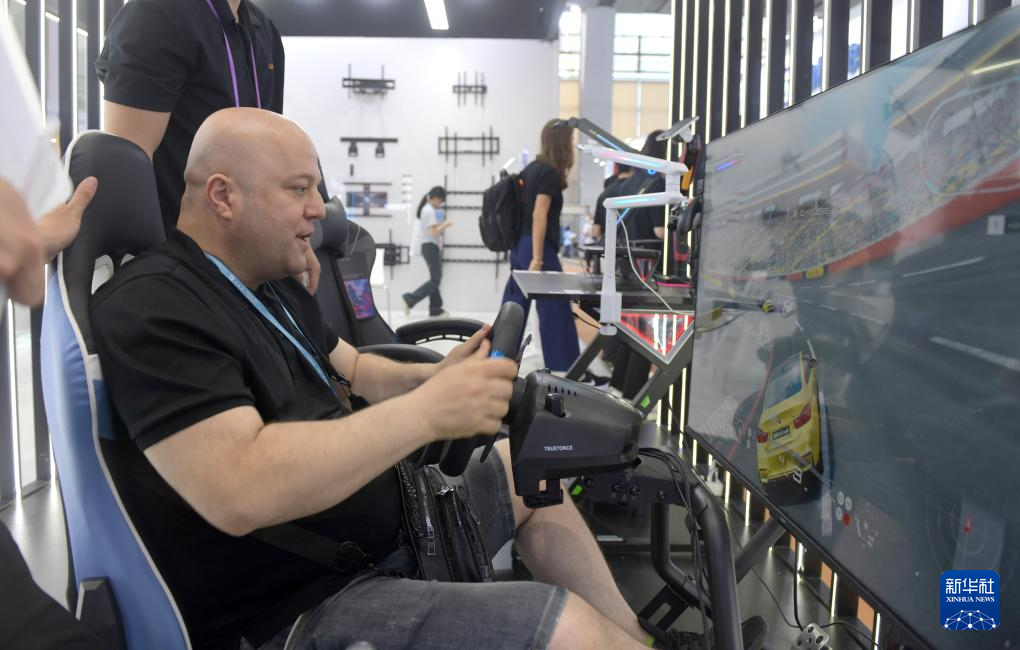 4月15日,客商在广交会展馆内体验赛车游戏。