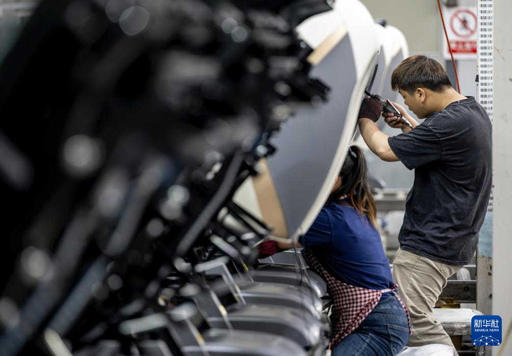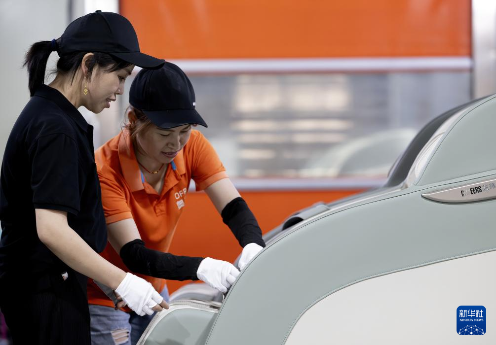4月16日,在奥弗锐(福建)电子科技有限公司按摩椅生产线上,两名工人在检验生产出口德国和韩国的智能按摩椅产品。