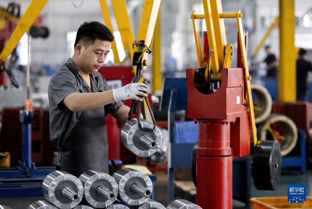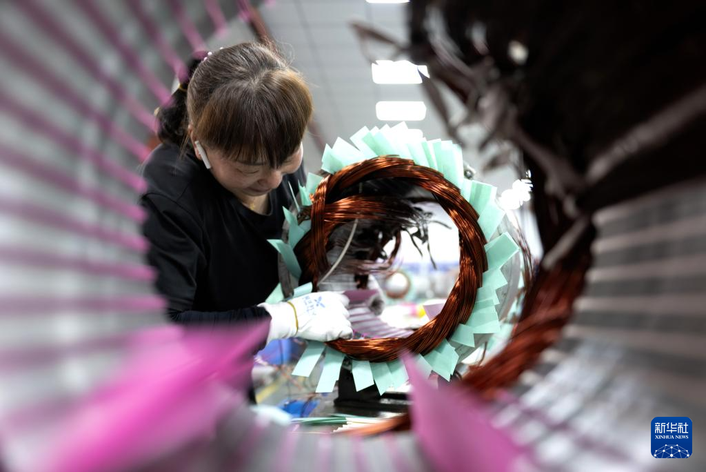 4月16日,在位于宁德市东侨经济技术开发区的安波电机(宁德)有限公司生产车间,工作人员在安装出口的电机产品。