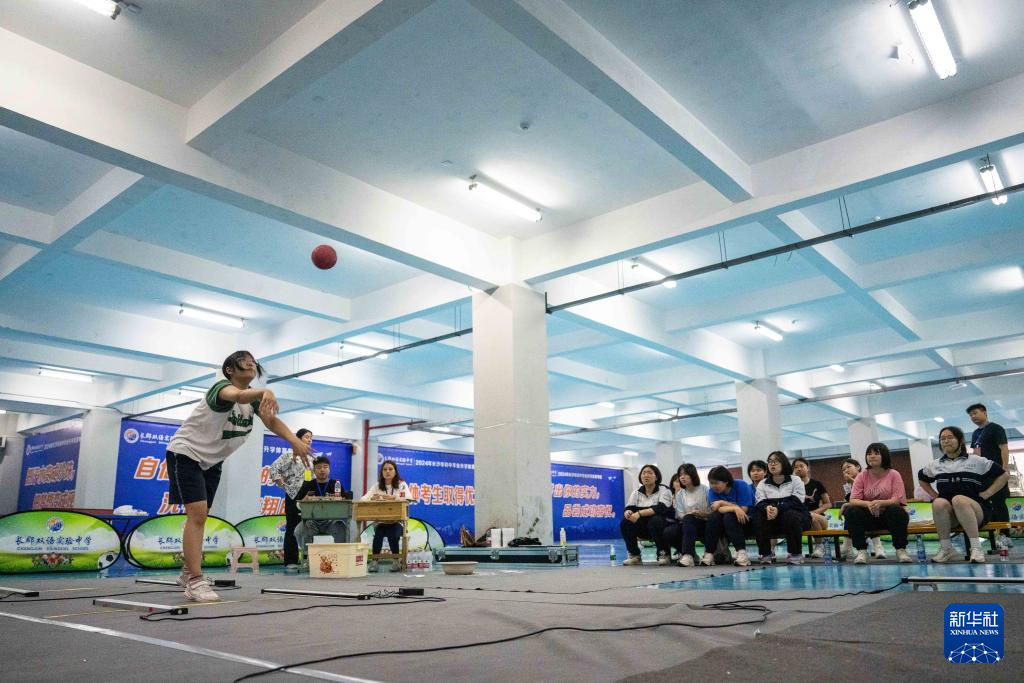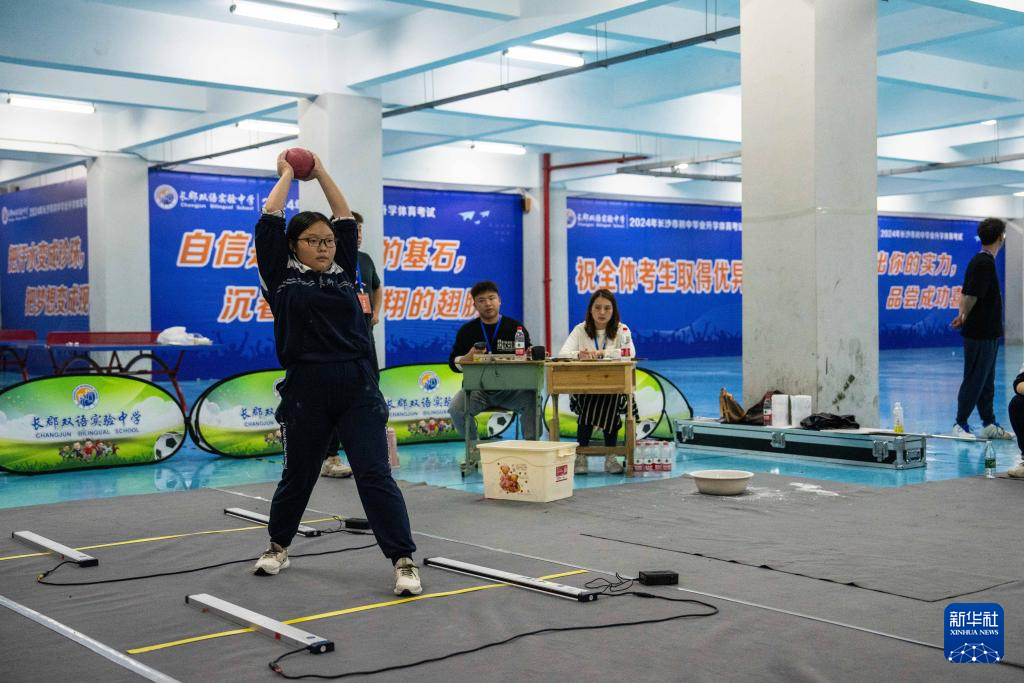 4月16日,在长沙市长郡双语实验中学,考生在进行投掷实心球考试。