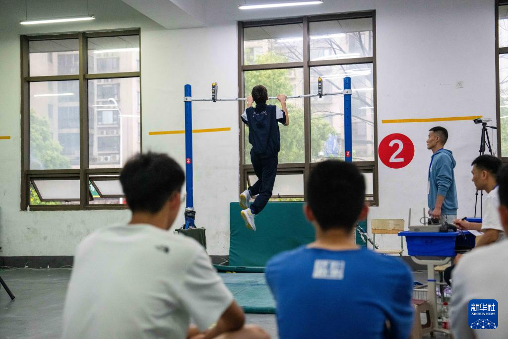 4月16日,在长沙市长郡双语实验中学,考生在进行引体向上考试。