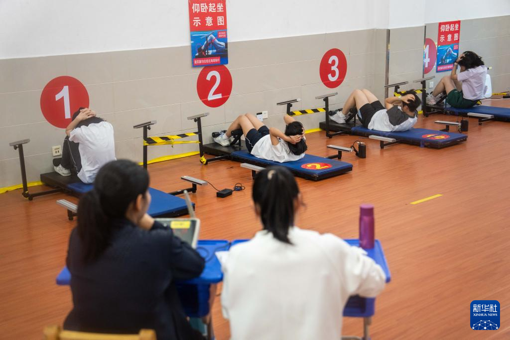 4月16日,在长沙市长郡双语实验中学,考生在进行仰卧起坐考试。