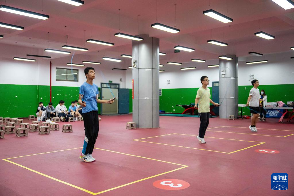 4月16日,在长沙市长郡双语实验中学,考生在进行跳绳考试。