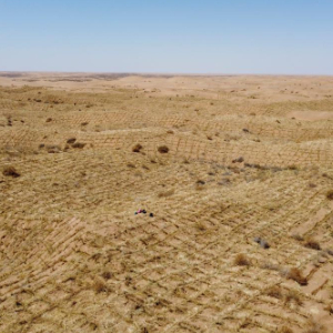 4月10日,群众在古浪县八步沙林场麻黄塘沙区用草方格压沙(无人机照片)。