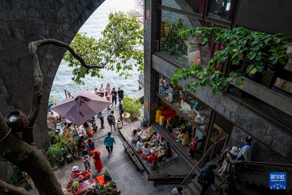 游客在大理市双廊古镇休闲游玩(4月15日摄)。