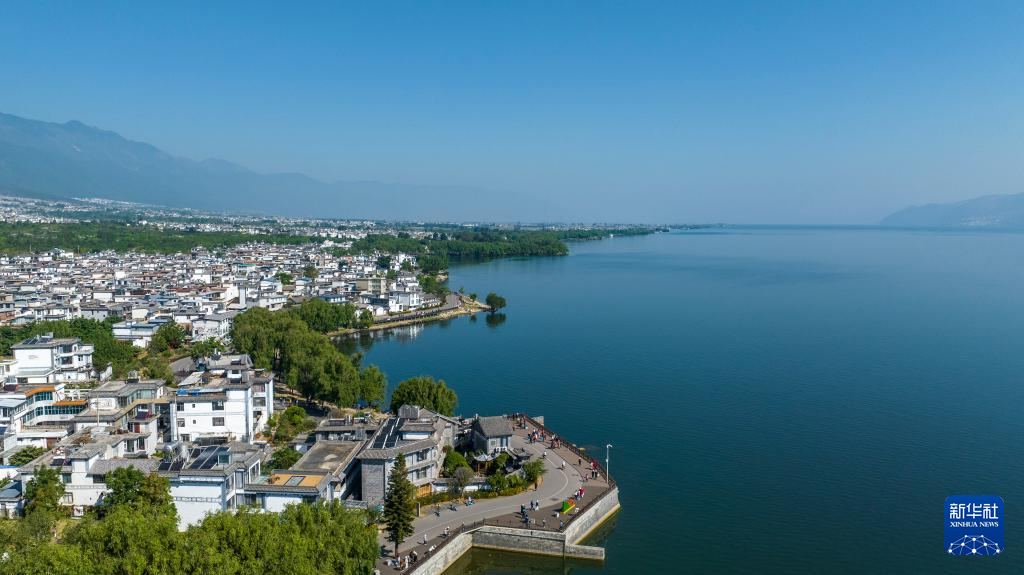 人们在大理市洱海边的生态廊道游览(无人机照片,4月14日摄)。
