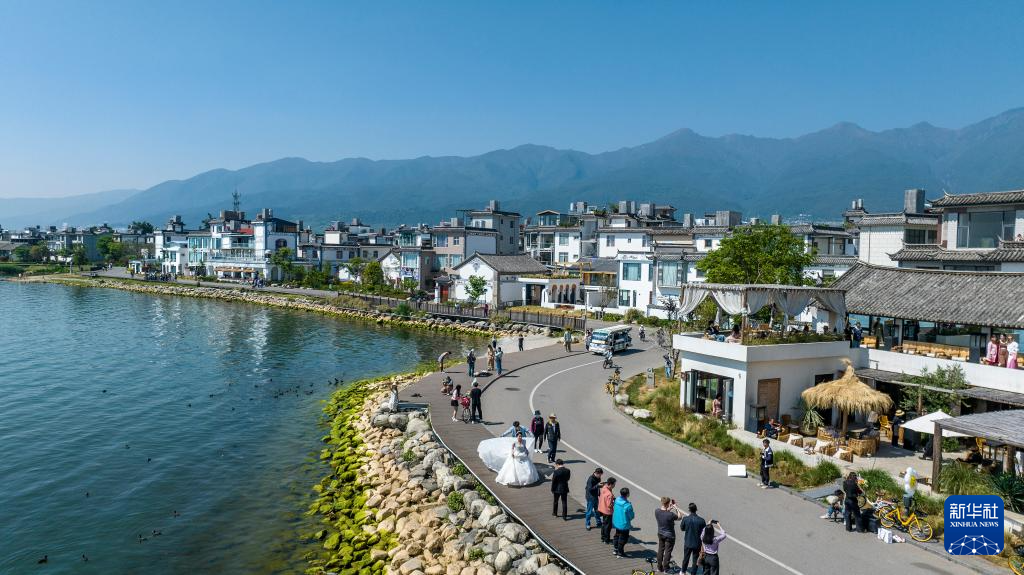 一对情侣在大理市洱海边的生态廊道拍摄婚纱照(4月14日摄)。