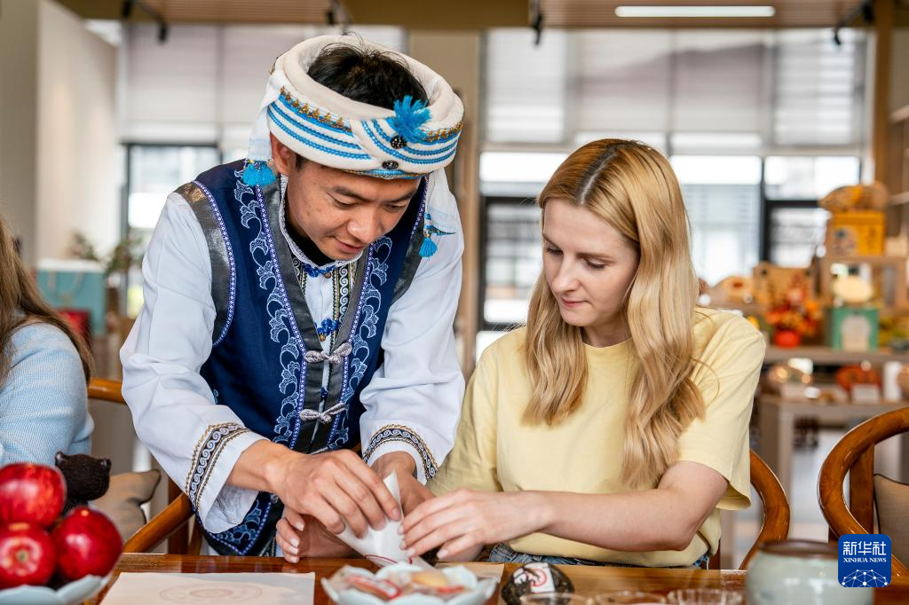 一名俄罗斯塔斯社记者(右)在大理市体验包装下关沱茶(4月13日摄)。