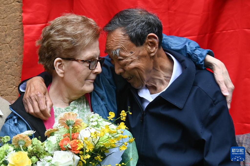 4月17日,在衢州江山市张村乡龙头店村,“杜立特行动”3号机领航员查尔斯·奥祖克的女儿苏珊·奥祖克(左)与村民廖明发相拥。1942年,村民廖诗原(廖明发的父亲)一家曾悉心照顾跳伞降落的查尔斯·奥祖克。